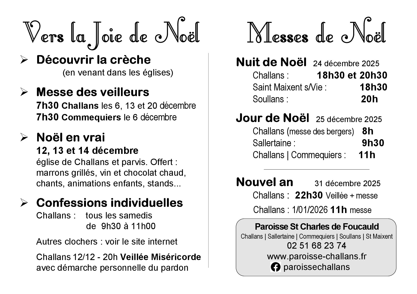| Challans | ● Tous les samedis de 9h30 à 10h30 ● Vendredi12 décembre à 20h pendant la veillée |